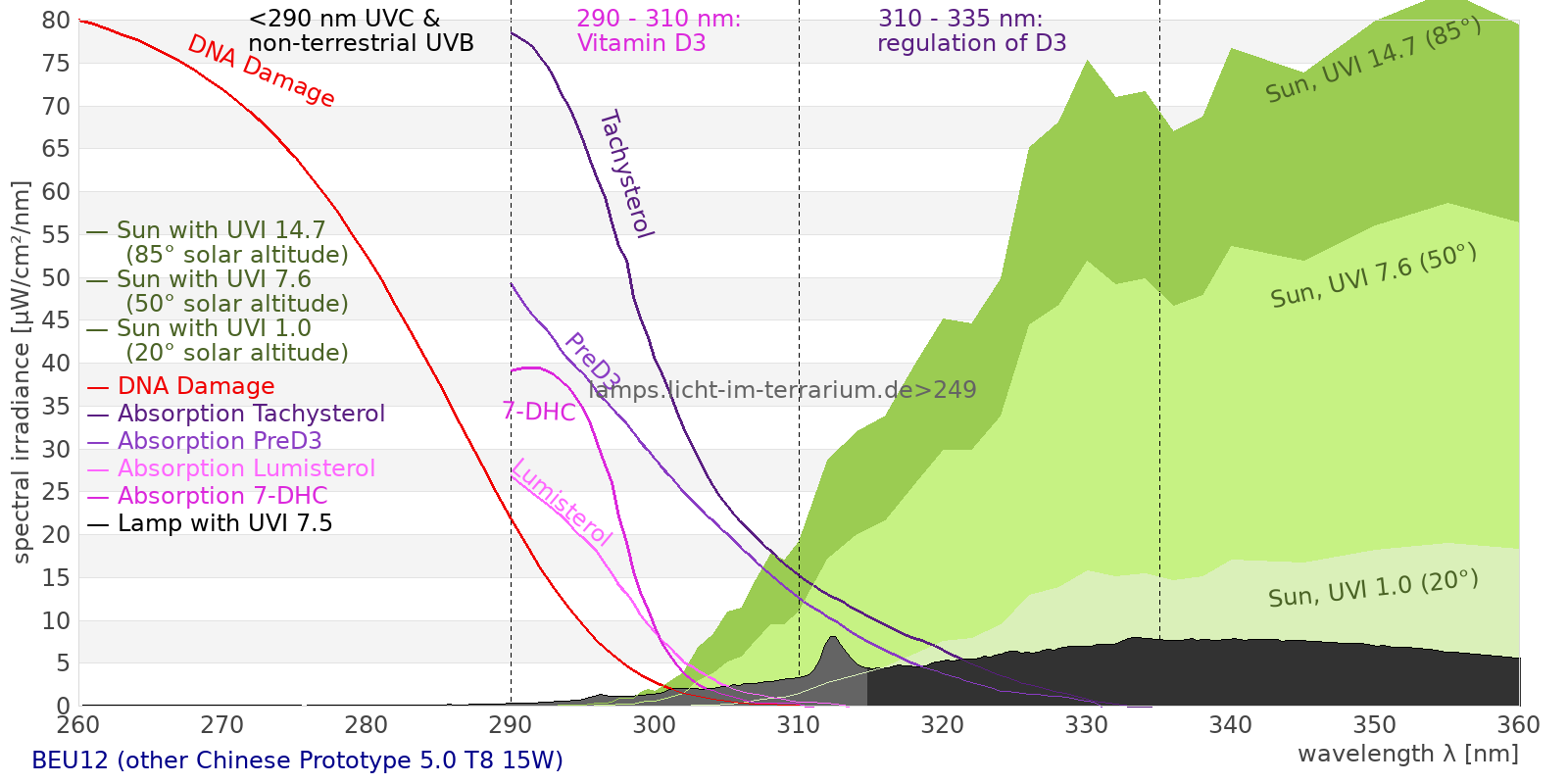 Erythema 4.13 UV-Index Pyrimidine dimerization of DNA 19.3 µW/cm² Photoceratitis 5.73 µW/cm² Photoconjunctivitis 1.75 µW/cm² DNA Damage 2.4 Vitamin D3 12.5 µW/cm² Photosynthesis 355 µW/cm² Luminosity 1270 lx Human L-Cone 184 µW/cm² Human M-Cone 169 µW/cm² Human S-Cone 150 µW/cm² CIE X 166 µW/cm² CIE Y 175 µW/cm² CIE Z 274 µW/cm² PAR PPFD 23.6 µmol/m²/s Extinction preD3 76.6 e-3*m²/mol Extinction Tachysterol 251 e-3*m²/mol Exctincition PreD3 46600 m²/mol Extinction Lumisterol 33.1 m²/mol Exctincition Tachysterol 348000 m²/mol Extinction 7DHC 38.9 m²/mol L-Cone 147 µW/cm² M-Cone 181 µW/cm² S-Cone 272 µW/cm² U-Cone 205 µW/cm² UVR - ICNIRP 2004 4.94 Rel Biol Eff Melatonin Supression 200 µW/cm² Blue Light Hazard 172 µW/cm² (136 µW/cm² per 1000 lx) CIE 174:2006 PreVit D3 13.4 µW/cm² Lumen Reptil 1690 "pseudo-lx" Vitamin D3 Degradation 10.2 µW/cm² Actinic UV 4.88 µW/cm² (38.6 mW/klm) Exctincition Lumisterol 38900 m²/mol Exctincition 7DHC 44300 m²/mol Exctincition Toxisterols 12200 m²/mol