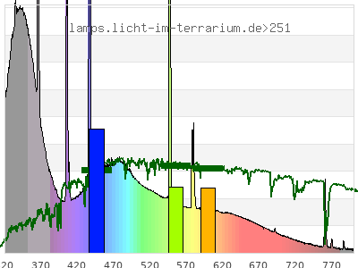 Whereas a spectrometer measures the intensity in every tiny wavelength interval resulting in thousands of individual intensities, the human eye only measures three intensities detected by the three cones. The same is true for the reptile eye with usually three or four photoreceptors. Effectively the detailled spectrum displayed above reduces to a much compacter bar graph displayed below. The photoreceptor sensitivites from these L-Cone, M-Cone, S-Cone, and U-Cone are used, they are chosen as an average of measured reptile photoreceptor sensitivity curves. The bar graph also shows as reference the intensity seen by the three or four photoreceptors for average sunlight (ASTM spectrum).