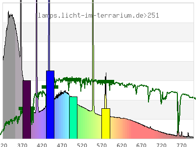 total ( 0 nm - 0 nm) 642 µW/cm² = 6.42 W/m² UVC ( 0 nm - 280 nm) 0.758 µW/cm² = 0.00758 W/m² non-terrestrial ( 0 nm - 290 nm) 1.29 µW/cm² = 0.0129 W/m² total2 ( 250 nm - 880 nm) 642 µW/cm² = 6.42 W/m² UVB (EU) ( 280 nm - 315 nm) 28.9 µW/cm² = 0.289 W/m² UVB (US) ( 280 nm - 320 nm) 40.8 µW/cm² = 0.408 W/m² UVA+B ( 280 nm - 380 nm) 238 µW/cm² = 2.38 W/m² Solar UVB ( 290 nm - 315 nm) 28.3 µW/cm² = 0.283 W/m² UVA D3 regulating ( 315 nm - 335 nm) 61.2 µW/cm² = 0.612 W/m² UVA (EU) ( 315 nm - 380 nm) 209 µW/cm² = 2.09 W/m² UVA2 (medical definition) ( 320 nm - 340 nm) 70.1 µW/cm² = 0.701 W/m² UVA (US) ( 320 nm - 380 nm) 198 µW/cm² = 1.98 W/m² UVA1 (variant) ( 335 nm - 380 nm) 148 µW/cm² = 1.48 W/m² UVA1 (medical) ( 340 nm - 400 nm) 149 µW/cm² = 1.49 W/m² vis. UVA ( 350 nm - 380 nm) 87.7 µW/cm² = 0.877 W/m² VIS Rep3 ( 350 nm - 600 nm) 411 µW/cm² = 4.11 W/m² VIS Rep4 ( 350 nm - 700 nm) 467 µW/cm² = 4.67 W/m² purple ( 380 nm - 420 nm) 56.3 µW/cm² = 0.563 W/m² VIS ( 380 nm - 780 nm) 394 µW/cm² = 3.94 W/m² VIS2 ( 400 nm - 680 nm) 350 µW/cm² = 3.5 W/m² PAR ( 400 nm - 700 nm) 357 µW/cm² = 3.57 W/m² tmp ( 400 nm - 1100 nm) 382 µW/cm² = 3.82 W/m² blue ( 420 nm - 490 nm) 141 µW/cm² = 1.41 W/m² green ( 490 nm - 575 nm) 104 µW/cm² = 1.04 W/m² yellow ( 575 nm - 585 nm) 12.1 µW/cm² = 0.121 W/m² orange ( 585 nm - 650 nm) 44.1 µW/cm² = 0.441 W/m² red ( 650 nm - 780 nm) 37.3 µW/cm² = 0.373 W/m² IR2 ( 655 nm - 685 nm) 13.9 µW/cm² = 0.139 W/m² IRA ( 700 nm - 1400 nm) 24.6 µW/cm² = 0.246 W/m² IRB ( 1400 nm - 3000 nm) 0 µW/cm² = 0 W/m²