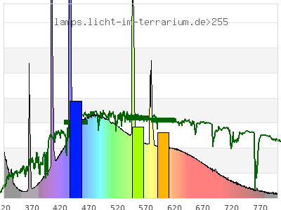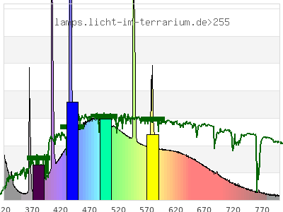 total ( 0 nm - 0 nm) 765 µW/cm² = 7.65 W/m² UVC ( 0 nm - 280 nm) 0.785 µW/cm² = 0.00785 W/m² non-terrestrial ( 0 nm - 290 nm) 4.21 µW/cm² = 0.0421 W/m² total2 ( 250 nm - 880 nm) 765 µW/cm² = 7.65 W/m² UVB (EU) ( 280 nm - 315 nm) 53.9 µW/cm² = 0.539 W/m² UVB (US) ( 280 nm - 320 nm) 62.1 µW/cm² = 0.621 W/m² UVA+B ( 280 nm - 380 nm) 98.9 µW/cm² = 0.989 W/m² Solar UVB ( 290 nm - 315 nm) 50.5 µW/cm² = 0.505 W/m² UVA D3 regulating ( 315 nm - 335 nm) 22 µW/cm² = 0.22 W/m² UVA (EU) ( 315 nm - 380 nm) 45 µW/cm² = 0.45 W/m² UVA2 (medical definition) ( 320 nm - 340 nm) 16.2 µW/cm² = 0.162 W/m² UVA (US) ( 320 nm - 380 nm) 36.8 µW/cm² = 0.368 W/m² UVA1 (variant) ( 335 nm - 380 nm) 23 µW/cm² = 0.23 W/m² UVA1 (medical) ( 340 nm - 400 nm) 33.5 µW/cm² = 0.335 W/m² vis. UVA ( 350 nm - 380 nm) 17.8 µW/cm² = 0.178 W/m² VIS Rep3 ( 350 nm - 600 nm) 525 µW/cm² = 5.25 W/m² VIS Rep4 ( 350 nm - 700 nm) 646 µW/cm² = 6.46 W/m² purple ( 380 nm - 420 nm) 56.9 µW/cm² = 0.569 W/m² VIS ( 380 nm - 780 nm) 659 µW/cm² = 6.59 W/m² VIS2 ( 400 nm - 680 nm) 599 µW/cm² = 5.99 W/m² PAR ( 400 nm - 700 nm) 615 µW/cm² = 6.15 W/m² tmp ( 400 nm - 1100 nm) 653 µW/cm² = 6.53 W/m² blue ( 420 nm - 490 nm) 202 µW/cm² = 2.02 W/m² green ( 490 nm - 575 nm) 200 µW/cm² = 2 W/m² yellow ( 575 nm - 585 nm) 25.8 µW/cm² = 0.258 W/m² orange ( 585 nm - 650 nm) 94.6 µW/cm² = 0.946 W/m² red ( 650 nm - 780 nm) 79.9 µW/cm² = 0.799 W/m² IR2 ( 655 nm - 685 nm) 30.9 µW/cm² = 0.309 W/m² IRA ( 700 nm - 1400 nm) 37.6 µW/cm² = 0.376 W/m² IRB ( 1400 nm - 3000 nm) 0 µW/cm² = 0 W/m²