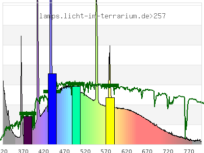Whereas a spectrometer measures the intensity in every tiny wavelength interval resulting in thousands of individual intensities, the human eye only measures three intensities detected by the three cones. The same is true for the reptile eye with usually three or four photoreceptors. Effectively the detailled spectrum displayed above reduces to a much compacter bar graph displayed below. The photoreceptor sensitivites from these L-Cone, M-Cone, S-Cone, and U-Cone are used, they are chosen as an average of measured reptile photoreceptor sensitivity curves. The bar graph also shows as reference the intensity seen by the three or four photoreceptors for average sunlight (ASTM spectrum).