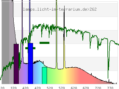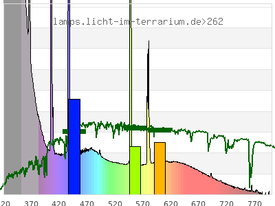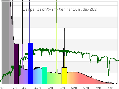 total ( 0 nm - 0 nm) 746 µW/cm² = 7.46 W/m² UVC ( 0 nm - 280 nm) 0.606 µW/cm² = 0.00606 W/m² non-terrestrial ( 0 nm - 290 nm) 0.821 µW/cm² = 0.00821 W/m² total2 ( 250 nm - 880 nm) 746 µW/cm² = 7.46 W/m² UVB (EU) ( 280 nm - 315 nm) 69.5 µW/cm² = 0.695 W/m² UVB (US) ( 280 nm - 320 nm) 105 µW/cm² = 1.05 W/m² UVA+B ( 280 nm - 380 nm) 416 µW/cm² = 4.16 W/m² Solar UVB ( 290 nm - 315 nm) 69.3 µW/cm² = 0.693 W/m² UVA D3 regulating ( 315 nm - 335 nm) 143 µW/cm² = 1.43 W/m² UVA (EU) ( 315 nm - 380 nm) 347 µW/cm² = 3.47 W/m² UVA2 (medical definition) ( 320 nm - 340 nm) 147 µW/cm² = 1.47 W/m² UVA (US) ( 320 nm - 380 nm) 311 µW/cm² = 3.11 W/m² UVA1 (variant) ( 335 nm - 380 nm) 204 µW/cm² = 2.04 W/m² UVA1 (medical) ( 340 nm - 400 nm) 187 µW/cm² = 1.87 W/m² vis. UVA ( 350 nm - 380 nm) 99.6 µW/cm² = 0.996 W/m² VIS Rep3 ( 350 nm - 600 nm) 369 µW/cm² = 3.69 W/m² VIS Rep4 ( 350 nm - 700 nm) 418 µW/cm² = 4.18 W/m² purple ( 380 nm - 420 nm) 58.7 µW/cm² = 0.587 W/m² VIS ( 380 nm - 780 nm) 329 µW/cm² = 3.29 W/m² VIS2 ( 400 nm - 680 nm) 290 µW/cm² = 2.9 W/m² PAR ( 400 nm - 700 nm) 296 µW/cm² = 2.96 W/m² tmp ( 400 nm - 1100 nm) 308 µW/cm² = 3.08 W/m² blue ( 420 nm - 490 nm) 115 µW/cm² = 1.15 W/m² green ( 490 nm - 575 nm) 73.9 µW/cm² = 0.739 W/m² yellow ( 575 nm - 585 nm) 12.8 µW/cm² = 0.128 W/m² orange ( 585 nm - 650 nm) 38 µW/cm² = 0.38 W/m² red ( 650 nm - 780 nm) 30.9 µW/cm² = 0.309 W/m² IR2 ( 655 nm - 685 nm) 12.8 µW/cm² = 0.128 W/m² IRA ( 700 nm - 1400 nm) 11.1 µW/cm² = 0.111 W/m² IRB ( 1400 nm - 3000 nm) 0 µW/cm² = 0 W/m²