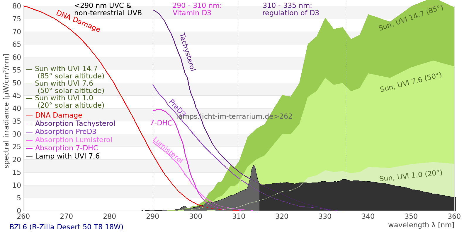 Erythema 5.15 UV-Index Pyrimidine dimerization of DNA 42.5 µW/cm² Photoceratitis 7.73 µW/cm² Photoconjunctivitis 0.76 µW/cm² DNA Damage 1.22 Vitamin D3 20.4 µW/cm² Photosynthesis 219 µW/cm² Luminosity 676 lx Human L-Cone 98.9 µW/cm² Human M-Cone 88.4 µW/cm² Human S-Cone 104 µW/cm² CIE X 101 µW/cm² CIE Y 93.1 µW/cm² CIE Z 186 µW/cm² PAR PPFD 14.5 µmol/m²/s Extinction preD3 125 e-3*m²/mol Extinction Tachysterol 431 e-3*m²/mol Exctincition PreD3 62500 m²/mol Extinction Lumisterol 25.9 m²/mol Exctincition Tachysterol 603000 m²/mol Extinction 7DHC 25.6 m²/mol L-Cone 80.5 µW/cm² M-Cone 83.3 µW/cm² S-Cone 200 µW/cm² U-Cone 197 µW/cm² UVR - ICNIRP 2004 4.53 Rel Biol Eff Melatonin Supression 125 µW/cm² Blue Light Hazard 122 µW/cm² (180 µW/cm² per 1000 lx) CIE 174:2006 PreVit D3 22.5 µW/cm² Lumen Reptil 1100 "pseudo-lx" Vitamin D3 Degradation 20.7 µW/cm² Actinic UV 4.48 µW/cm² (66.2 mW/klm) Exctincition Lumisterol 34100 m²/mol Exctincition 7DHC 31400 m²/mol Exctincition Toxisterols 13800 m²/mol