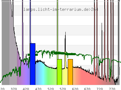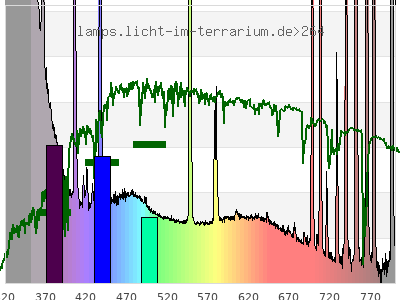 Whereas a spectrometer measures the intensity in every tiny wavelength interval resulting in thousands of individual intensities, the human eye only measures three intensities detected by the three cones. The same is true for the reptile eye with usually three or four photoreceptors. Effectively the detailled spectrum displayed above reduces to a much compacter bar graph displayed below. The photoreceptor sensitivites from these L-Cone, M-Cone, S-Cone, and U-Cone are used, they are chosen as an average of measured reptile photoreceptor sensitivity curves. The bar graph also shows as reference the intensity seen by the three or four photoreceptors for average sunlight (ASTM spectrum).