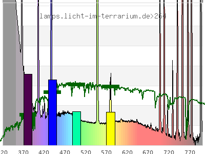 total ( 0 nm - 0 nm) 197 µW/cm² = 1.97 W/m² UVC ( 0 nm - 280 nm) 0.221 µW/cm² = 0.00221 W/m² non-terrestrial ( 0 nm - 290 nm) 0.296 µW/cm² = 0.00296 W/m² total2 ( 250 nm - 880 nm) 197 µW/cm² = 1.97 W/m² UVB (EU) ( 280 nm - 315 nm) 6.25 µW/cm² = 0.0625 W/m² UVB (US) ( 280 nm - 320 nm) 9.61 µW/cm² = 0.0961 W/m² UVA+B ( 280 nm - 380 nm) 46 µW/cm² = 0.46 W/m² Solar UVB ( 290 nm - 315 nm) 6.18 µW/cm² = 0.0618 W/m² UVA D3 regulating ( 315 nm - 335 nm) 14.3 µW/cm² = 0.143 W/m² UVA (EU) ( 315 nm - 380 nm) 39.7 µW/cm² = 0.397 W/m² UVA2 (medical definition) ( 320 nm - 340 nm) 15.1 µW/cm² = 0.151 W/m² UVA (US) ( 320 nm - 380 nm) 36.4 µW/cm² = 0.364 W/m² UVA1 (variant) ( 335 nm - 380 nm) 25.5 µW/cm² = 0.255 W/m² UVA1 (medical) ( 340 nm - 400 nm) 24.9 µW/cm² = 0.249 W/m² vis. UVA ( 350 nm - 380 nm) 14 µW/cm² = 0.14 W/m² VIS Rep3 ( 350 nm - 600 nm) 54.8 µW/cm² = 0.548 W/m² VIS Rep4 ( 350 nm - 700 nm) 65.7 µW/cm² = 0.657 W/m² purple ( 380 nm - 420 nm) 8.41 µW/cm² = 0.0841 W/m² VIS ( 380 nm - 780 nm) 89.1 µW/cm² = 0.891 W/m² VIS2 ( 400 nm - 680 nm) 44.7 µW/cm² = 0.447 W/m² PAR ( 400 nm - 700 nm) 48.1 µW/cm² = 0.481 W/m² tmp ( 400 nm - 1100 nm) 147 µW/cm² = 1.47 W/m² blue ( 420 nm - 490 nm) 16.1 µW/cm² = 0.161 W/m² green ( 490 nm - 575 nm) 13.1 µW/cm² = 0.131 W/m² yellow ( 575 nm - 585 nm) 1.66 µW/cm² = 0.0166 W/m² orange ( 585 nm - 650 nm) 6.62 µW/cm² = 0.0662 W/m² red ( 650 nm - 780 nm) 43.2 µW/cm² = 0.432 W/m² IR2 ( 655 nm - 685 nm) 2.34 µW/cm² = 0.0234 W/m² IRA ( 700 nm - 1400 nm) 98.9 µW/cm² = 0.989 W/m² IRB ( 1400 nm - 3000 nm) 0 µW/cm² = 0 W/m²