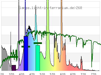 total ( 0 nm - 0 nm) 2030 µW/cm² = 20.3 W/m² UVC ( 0 nm - 280 nm) 0.451 µW/cm² = 0.00451 W/m² non-terrestrial ( 0 nm - 290 nm) 0.715 µW/cm² = 0.00715 W/m² total2 ( 250 nm - 880 nm) 2030 µW/cm² = 20.3 W/m² UVB (EU) ( 280 nm - 315 nm) 47.8 µW/cm² = 0.478 W/m² UVB (US) ( 280 nm - 320 nm) 73.7 µW/cm² = 0.737 W/m² UVA+B ( 280 nm - 380 nm) 237 µW/cm² = 2.37 W/m² Solar UVB ( 290 nm - 315 nm) 47.5 µW/cm² = 0.475 W/m² UVA D3 regulating ( 315 nm - 335 nm) 91.7 µW/cm² = 0.917 W/m² UVA (EU) ( 315 nm - 380 nm) 189 µW/cm² = 1.89 W/m² UVA2 (medical definition) ( 320 nm - 340 nm) 87.7 µW/cm² = 0.877 W/m² UVA (US) ( 320 nm - 380 nm) 164 µW/cm² = 1.64 W/m² UVA1 (variant) ( 335 nm - 380 nm) 97.8 µW/cm² = 0.978 W/m² UVA1 (medical) ( 340 nm - 400 nm) 82.1 µW/cm² = 0.821 W/m² vis. UVA ( 350 nm - 380 nm) 41.5 µW/cm² = 0.415 W/m² VIS Rep3 ( 350 nm - 600 nm) 1490 µW/cm² = 14.9 W/m² VIS Rep4 ( 350 nm - 700 nm) 1800 µW/cm² = 18 W/m² purple ( 380 nm - 420 nm) 75.1 µW/cm² = 0.751 W/m² VIS ( 380 nm - 780 nm) 1790 µW/cm² = 17.9 W/m² VIS2 ( 400 nm - 680 nm) 1740 µW/cm² = 17.4 W/m² PAR ( 400 nm - 700 nm) 1750 µW/cm² = 17.5 W/m² tmp ( 400 nm - 1100 nm) 1780 µW/cm² = 17.8 W/m² blue ( 420 nm - 490 nm) 671 µW/cm² = 6.71 W/m² green ( 490 nm - 575 nm) 583 µW/cm² = 5.83 W/m² yellow ( 575 nm - 585 nm) 52.6 µW/cm² = 0.526 W/m² orange ( 585 nm - 650 nm) 328 µW/cm² = 3.28 W/m² red ( 650 nm - 780 nm) 79.4 µW/cm² = 0.794 W/m² IR2 ( 655 nm - 685 nm) 29.4 µW/cm² = 0.294 W/m² IRA ( 700 nm - 1400 nm) 31 µW/cm² = 0.31 W/m² IRB ( 1400 nm - 3000 nm) 0 µW/cm² = 0 W/m²