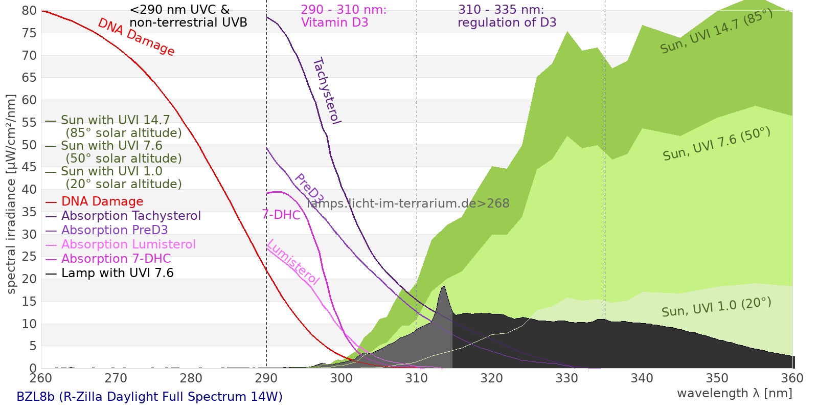 Erythema 3.17 UV-Index Pyrimidine dimerization of DNA 29.1 µW/cm² Photoceratitis 4.94 µW/cm² Photoconjunctivitis 0.517 µW/cm² DNA Damage 0.81 Vitamin D3 13.1 µW/cm² Photosynthesis 1230 µW/cm² Luminosity 5220 lx Human L-Cone 763 µW/cm² Human M-Cone 682 µW/cm² Human S-Cone 543 µW/cm² CIE X 690 µW/cm² CIE Y 724 µW/cm² CIE Z 1020 µW/cm² PAR PPFD 79.6 µmol/m²/s Extinction preD3 84.6 e-3*m²/mol Extinction Tachysterol 290 e-3*m²/mol Exctincition PreD3 41500 m²/mol Extinction Lumisterol 16.5 m²/mol Exctincition Tachysterol 399000 m²/mol Extinction 7DHC 15.8 m²/mol L-Cone 613 µW/cm² M-Cone 681 µW/cm² S-Cone 928 µW/cm² U-Cone 151 µW/cm² UVR - ICNIRP 2004 2.78 Rel Biol Eff Melatonin Supression 708 µW/cm² Blue Light Hazard 594 µW/cm² (114 µW/cm² per 1000 lx) CIE 174:2006 PreVit D3 14.5 µW/cm² Lumen Reptil 5500 "pseudo-lx" Vitamin D3 Degradation 14.2 µW/cm² Actinic UV 2.76 µW/cm² (5.29 mW/klm) Exctincition Lumisterol 22300 m²/mol Exctincition 7DHC 19200 m²/mol Exctincition Toxisterols 8050 m²/mol