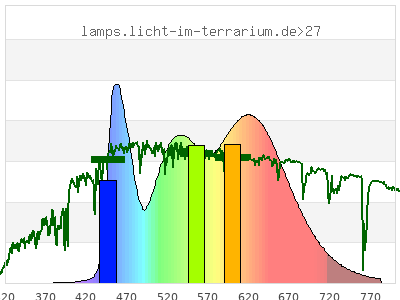Erythema 7.95E-6 UV-Index Pyrimidine dimerization of DNA 0 µW/cm² Photoceratitis 0 µW/cm² Photoconjunctivitis 0 µW/cm² DNA Damage 0 Vitamin D3 0 µW/cm² Photosynthesis 115 µW/cm² Luminosity 534 lx Human L-Cone 81.2 µW/cm² Human M-Cone 63.5 µW/cm² Human S-Cone 27.6 µW/cm² CIE X 74.6 µW/cm² CIE Y 74.2 µW/cm² CIE Z 55.3 µW/cm² PAR PPFD 8.04 µmol/m²/s Extinction preD3 0 e-3*m²/mol Extinction Tachysterol 0 e-3*m²/mol Exctincition PreD3 0 m²/mol Extinction Lumisterol 0 m²/mol Exctincition Tachysterol 0 m²/mol Extinction 7DHC 0 m²/mol L-Cone 71 µW/cm² M-Cone 59.6 µW/cm² S-Cone 39.1 µW/cm² U-Cone 0.691 µW/cm² UVR - ICNIRP 2004 5.09E-6 Rel Biol Eff Melatonin Supression 42.8 µW/cm² Blue Light Hazard 28.5 µW/cm² (53.4 µW/cm² per 1000 lx) CIE 174:2006 PreVit D3 0 µW/cm² Lumen Reptil 436 "pseudo-lx" Vitamin D3 Degradation 0 µW/cm² Actinic UV 5.08E-6 µW/cm² (9.51E-5 mW/klm) Exctincition Lumisterol 0 m²/mol Exctincition 7DHC 0 m²/mol Exctincition Toxisterols 0 m²/mol