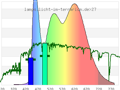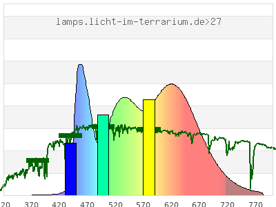 Whereas a spectrometer measures the intensity in every tiny wavelength interval resulting in thousands of individual intensities, the human eye only measures three intensities detected by the three cones. The same is true for the reptile eye with usually three or four photoreceptors. Effectively the detailled spectrum displayed above reduces to a much compacter bar graph displayed below. The photoreceptor sensitivites from these L-Cone, M-Cone, S-Cone, and U-Cone are used, they are chosen as an average of measured reptile photoreceptor sensitivity curves. The bar graph also shows as reference the intensity seen by the three or four photoreceptors for average sunlight (ASTM spectrum).