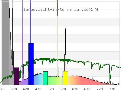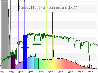 total ( 0 nm - 0 nm) 734 µW/cm² = 7.34 W/m² UVC ( 0 nm - 280 nm) 0.467 µW/cm² = 0.00467 W/m² non-terrestrial ( 0 nm - 290 nm) 0.924 µW/cm² = 0.00924 W/m² total2 ( 250 nm - 880 nm) 734 µW/cm² = 7.34 W/m² UVB (EU) ( 280 nm - 315 nm) 99.7 µW/cm² = 0.997 W/m² UVB (US) ( 280 nm - 320 nm) 153 µW/cm² = 1.53 W/m² UVA+B ( 280 nm - 380 nm) 440 µW/cm² = 4.4 W/m² Solar UVB ( 290 nm - 315 nm) 99.2 µW/cm² = 0.992 W/m² UVA D3 regulating ( 315 nm - 335 nm) 184 µW/cm² = 1.84 W/m² UVA (EU) ( 315 nm - 380 nm) 341 µW/cm² = 3.41 W/m² UVA2 (medical definition) ( 320 nm - 340 nm) 173 µW/cm² = 1.73 W/m² UVA (US) ( 320 nm - 380 nm) 288 µW/cm² = 2.88 W/m² UVA1 (variant) ( 335 nm - 380 nm) 157 µW/cm² = 1.57 W/m² UVA1 (medical) ( 340 nm - 400 nm) 119 µW/cm² = 1.19 W/m² vis. UVA ( 350 nm - 380 nm) 52.9 µW/cm² = 0.529 W/m² VIS Rep3 ( 350 nm - 600 nm) 293 µW/cm² = 2.93 W/m² VIS Rep4 ( 350 nm - 700 nm) 334 µW/cm² = 3.34 W/m² purple ( 380 nm - 420 nm) 32.2 µW/cm² = 0.322 W/m² VIS ( 380 nm - 780 nm) 291 µW/cm² = 2.91 W/m² VIS2 ( 400 nm - 680 nm) 272 µW/cm² = 2.72 W/m² PAR ( 400 nm - 700 nm) 277 µW/cm² = 2.77 W/m² tmp ( 400 nm - 1100 nm) 289 µW/cm² = 2.89 W/m² blue ( 420 nm - 490 nm) 123 µW/cm² = 1.23 W/m² green ( 490 nm - 575 nm) 64.2 µW/cm² = 0.642 W/m² yellow ( 575 nm - 585 nm) 13.3 µW/cm² = 0.133 W/m² orange ( 585 nm - 650 nm) 31.2 µW/cm² = 0.312 W/m² red ( 650 nm - 780 nm) 26.9 µW/cm² = 0.269 W/m² IR2 ( 655 nm - 685 nm) 10.6 µW/cm² = 0.106 W/m² IRA ( 700 nm - 1400 nm) 11.6 µW/cm² = 0.116 W/m² IRB ( 1400 nm - 3000 nm) 0 µW/cm² = 0 W/m²