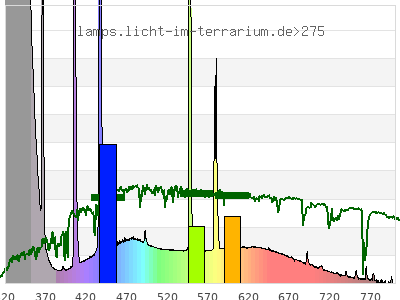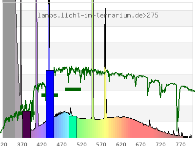 total ( 0 nm - 0 nm) 611 µW/cm² = 6.11 W/m² UVC ( 0 nm - 280 nm) 0.0532 µW/cm² = 0.000532 W/m² non-terrestrial ( 0 nm - 290 nm) 0.0693 µW/cm² = 0.000693 W/m² total2 ( 250 nm - 880 nm) 611 µW/cm² = 6.11 W/m² UVB (EU) ( 280 nm - 315 nm) 66.4 µW/cm² = 0.664 W/m² UVB (US) ( 280 nm - 320 nm) 105 µW/cm² = 1.05 W/m² UVA+B ( 280 nm - 380 nm) 338 µW/cm² = 3.38 W/m² Solar UVB ( 290 nm - 315 nm) 66.3 µW/cm² = 0.663 W/m² UVA D3 regulating ( 315 nm - 335 nm) 141 µW/cm² = 1.41 W/m² UVA (EU) ( 315 nm - 380 nm) 272 µW/cm² = 2.72 W/m² UVA2 (medical definition) ( 320 nm - 340 nm) 136 µW/cm² = 1.36 W/m² UVA (US) ( 320 nm - 380 nm) 233 µW/cm² = 2.33 W/m² UVA1 (variant) ( 335 nm - 380 nm) 131 µW/cm² = 1.31 W/m² UVA1 (medical) ( 340 nm - 400 nm) 101 µW/cm² = 1.01 W/m² vis. UVA ( 350 nm - 380 nm) 45.6 µW/cm² = 0.456 W/m² VIS Rep3 ( 350 nm - 600 nm) 270 µW/cm² = 2.7 W/m² VIS Rep4 ( 350 nm - 700 nm) 308 µW/cm² = 3.08 W/m² purple ( 380 nm - 420 nm) 29.7 µW/cm² = 0.297 W/m² VIS ( 380 nm - 780 nm) 272 µW/cm² = 2.72 W/m² VIS2 ( 400 nm - 680 nm) 254 µW/cm² = 2.54 W/m² PAR ( 400 nm - 700 nm) 259 µW/cm² = 2.59 W/m² tmp ( 400 nm - 1100 nm) 269 µW/cm² = 2.69 W/m² blue ( 420 nm - 490 nm) 115 µW/cm² = 1.15 W/m² green ( 490 nm - 575 nm) 60 µW/cm² = 0.6 W/m² yellow ( 575 nm - 585 nm) 12.5 µW/cm² = 0.125 W/m² orange ( 585 nm - 650 nm) 29.3 µW/cm² = 0.293 W/m² red ( 650 nm - 780 nm) 24.9 µW/cm² = 0.249 W/m² IR2 ( 655 nm - 685 nm) 9.99 µW/cm² = 0.0999 W/m² IRA ( 700 nm - 1400 nm) 9.97 µW/cm² = 0.0997 W/m² IRB ( 1400 nm - 3000 nm) 0 µW/cm² = 0 W/m²