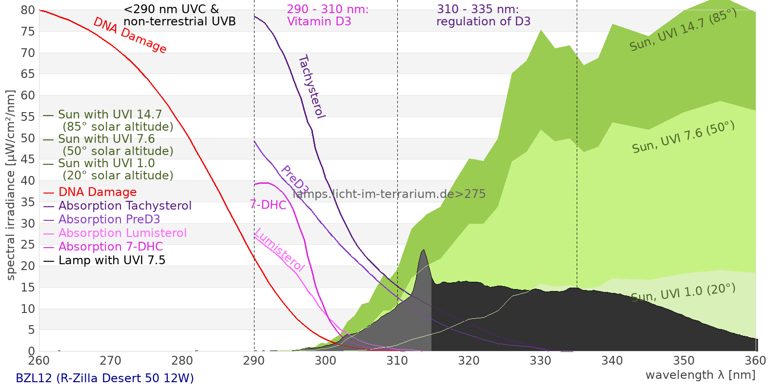 Erythema 3.53 UV-Index Pyrimidine dimerization of DNA 40.3 µW/cm² Photoceratitis 5.72 µW/cm² Photoconjunctivitis 0.136 µW/cm² DNA Damage 0.332 Vitamin D3 16.3 µW/cm² Photosynthesis 196 µW/cm² Luminosity 567 lx Human L-Cone 82.9 µW/cm² Human M-Cone 74.4 µW/cm² Human S-Cone 105 µW/cm² CIE X 91.1 µW/cm² CIE Y 77.8 µW/cm² CIE Z 189 µW/cm² PAR PPFD 12.5 µmol/m²/s Extinction preD3 110 e-3*m²/mol Extinction Tachysterol 383 e-3*m²/mol Exctincition PreD3 50600 m²/mol Extinction Lumisterol 13.4 m²/mol Exctincition Tachysterol 534000 m²/mol Extinction 7DHC 9.84 m²/mol L-Cone 67.1 µW/cm² M-Cone 65.5 µW/cm² S-Cone 204 µW/cm² U-Cone 81.2 µW/cm² UVR - ICNIRP 2004 2.55 Rel Biol Eff Melatonin Supression 117 µW/cm² Blue Light Hazard 120 µW/cm² (211 µW/cm² per 1000 lx) CIE 174:2006 PreVit D3 18.2 µW/cm² Lumen Reptil 854 "pseudo-lx" Vitamin D3 Degradation 19.6 µW/cm² Actinic UV 2.53 µW/cm² (44.6 mW/klm) Exctincition Lumisterol 20500 m²/mol Exctincition 7DHC 13400 m²/mol Exctincition Toxisterols 8820 m²/mol