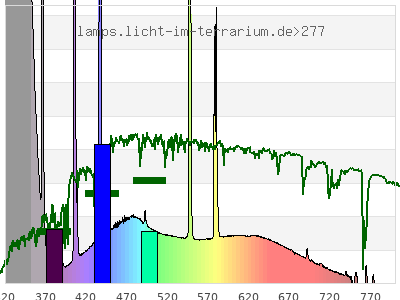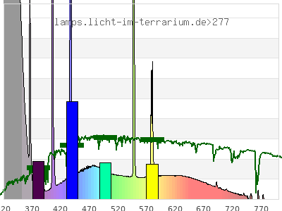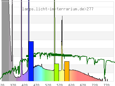 total ( 0 nm - 0 nm) 825 µW/cm² = 8.25 W/m² UVC ( 0 nm - 280 nm) 0 µW/cm² = 0 W/m² non-terrestrial ( 0 nm - 290 nm) 0 µW/cm² = 0 W/m² total2 ( 250 nm - 880 nm) 825 µW/cm² = 8.25 W/m² UVB (EU) ( 280 nm - 315 nm) 103 µW/cm² = 1.03 W/m² UVB (US) ( 280 nm - 320 nm) 160 µW/cm² = 1.6 W/m² UVA+B ( 280 nm - 380 nm) 469 µW/cm² = 4.69 W/m² Solar UVB ( 290 nm - 315 nm) 103 µW/cm² = 1.03 W/m² UVA D3 regulating ( 315 nm - 335 nm) 198 µW/cm² = 1.98 W/m² UVA (EU) ( 315 nm - 380 nm) 365 µW/cm² = 3.65 W/m² UVA2 (medical definition) ( 320 nm - 340 nm) 187 µW/cm² = 1.87 W/m² UVA (US) ( 320 nm - 380 nm) 308 µW/cm² = 3.08 W/m² UVA1 (variant) ( 335 nm - 380 nm) 167 µW/cm² = 1.67 W/m² UVA1 (medical) ( 340 nm - 400 nm) 126 µW/cm² = 1.26 W/m² vis. UVA ( 350 nm - 380 nm) 55.4 µW/cm² = 0.554 W/m² VIS Rep3 ( 350 nm - 600 nm) 350 µW/cm² = 3.5 W/m² VIS Rep4 ( 350 nm - 700 nm) 402 µW/cm² = 4.02 W/m² purple ( 380 nm - 420 nm) 37.1 µW/cm² = 0.371 W/m² VIS ( 380 nm - 780 nm) 356 µW/cm² = 3.56 W/m² VIS2 ( 400 nm - 680 nm) 335 µW/cm² = 3.35 W/m² PAR ( 400 nm - 700 nm) 342 µW/cm² = 3.42 W/m² tmp ( 400 nm - 1100 nm) 352 µW/cm² = 3.52 W/m² blue ( 420 nm - 490 nm) 148 µW/cm² = 1.48 W/m² green ( 490 nm - 575 nm) 83.3 µW/cm² = 0.833 W/m² yellow ( 575 nm - 585 nm) 16.2 µW/cm² = 0.162 W/m² orange ( 585 nm - 650 nm) 40.7 µW/cm² = 0.407 W/m² red ( 650 nm - 780 nm) 30.2 µW/cm² = 0.302 W/m² IR2 ( 655 nm - 685 nm) 13.5 µW/cm² = 0.135 W/m² IRA ( 700 nm - 1400 nm) 9.27 µW/cm² = 0.0927 W/m² IRB ( 1400 nm - 3000 nm) 0 µW/cm² = 0 W/m²