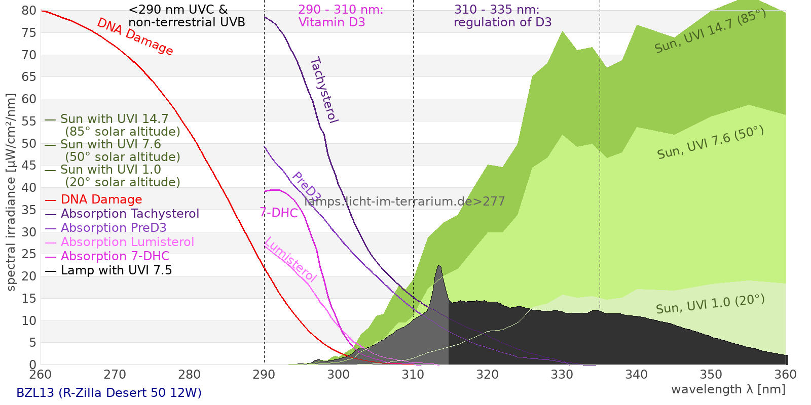 This process prevents any overdose of vitamin D3 from UV radiation with a spectrum similar to sunlight. As a comparison the solar spectra at 20°(id:14) and at 85°(id:21) solar angle are shown.