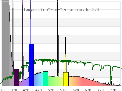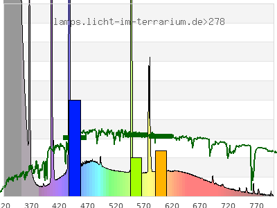 Whereas a spectrometer measures the intensity in every tiny wavelength interval resulting in thousands of individual intensities, the human eye only measures three intensities detected by the three cones. The same is true for the reptile eye with usually three or four photoreceptors. Effectively the detailled spectrum displayed above reduces to a much compacter bar graph displayed below. The photoreceptor sensitivites from these L-Cone, M-Cone, S-Cone, and U-Cone are used, they are chosen as an average of measured reptile photoreceptor sensitivity curves. The bar graph also shows as reference the intensity seen by the three or four photoreceptors for average sunlight (ASTM spectrum).