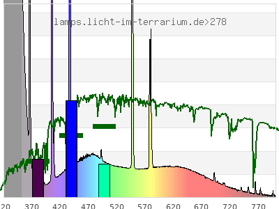 total ( 0 nm - 0 nm) 914 µW/cm² = 9.14 W/m² UVC ( 0 nm - 280 nm) 0.877 µW/cm² = 0.00877 W/m² non-terrestrial ( 0 nm - 290 nm) 1.44 µW/cm² = 0.0144 W/m² total2 ( 250 nm - 880 nm) 914 µW/cm² = 9.14 W/m² UVB (EU) ( 280 nm - 315 nm) 121 µW/cm² = 1.21 W/m² UVB (US) ( 280 nm - 320 nm) 187 µW/cm² = 1.87 W/m² UVA+B ( 280 nm - 380 nm) 539 µW/cm² = 5.39 W/m² Solar UVB ( 290 nm - 315 nm) 121 µW/cm² = 1.21 W/m² UVA D3 regulating ( 315 nm - 335 nm) 227 µW/cm² = 2.27 W/m² UVA (EU) ( 315 nm - 380 nm) 418 µW/cm² = 4.18 W/m² UVA2 (medical definition) ( 320 nm - 340 nm) 213 µW/cm² = 2.13 W/m² UVA (US) ( 320 nm - 380 nm) 353 µW/cm² = 3.53 W/m² UVA1 (variant) ( 335 nm - 380 nm) 191 µW/cm² = 1.91 W/m² UVA1 (medical) ( 340 nm - 400 nm) 145 µW/cm² = 1.45 W/m² vis. UVA ( 350 nm - 380 nm) 63.6 µW/cm² = 0.636 W/m² VIS Rep3 ( 350 nm - 600 nm) 368 µW/cm² = 3.68 W/m² VIS Rep4 ( 350 nm - 700 nm) 421 µW/cm² = 4.21 W/m² purple ( 380 nm - 420 nm) 38.9 µW/cm² = 0.389 W/m² VIS ( 380 nm - 780 nm) 370 µW/cm² = 3.7 W/m² VIS2 ( 400 nm - 680 nm) 345 µW/cm² = 3.45 W/m² PAR ( 400 nm - 700 nm) 352 µW/cm² = 3.52 W/m² tmp ( 400 nm - 1100 nm) 368 µW/cm² = 3.68 W/m² blue ( 420 nm - 490 nm) 159 µW/cm² = 1.59 W/m² green ( 490 nm - 575 nm) 81.1 µW/cm² = 0.811 W/m² yellow ( 575 nm - 585 nm) 15.7 µW/cm² = 0.157 W/m² orange ( 585 nm - 650 nm) 40.9 µW/cm² = 0.409 W/m² red ( 650 nm - 780 nm) 34.8 µW/cm² = 0.348 W/m² IR2 ( 655 nm - 685 nm) 13.8 µW/cm² = 0.138 W/m² IRA ( 700 nm - 1400 nm) 15.7 µW/cm² = 0.157 W/m² IRB ( 1400 nm - 3000 nm) 0 µW/cm² = 0 W/m²
