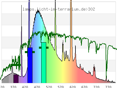 Whereas a spectrometer measures the intensity in every tiny wavelength interval resulting in thousands of individual intensities, the human eye only measures three intensities detected by the three cones. The same is true for the reptile eye with usually three or four photoreceptors. Effectively the detailled spectrum displayed above reduces to a much compacter bar graph displayed below. The photoreceptor sensitivites from these L-Cone, M-Cone, S-Cone, and U-Cone are used, they are chosen as an average of measured reptile photoreceptor sensitivity curves. The bar graph also shows as reference the intensity seen by the three or four photoreceptors for average sunlight (ASTM spectrum).