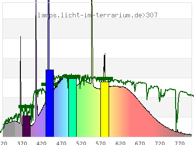 total ( 0 nm - 0 nm) 2020 µW/cm² = 20.2 W/m² UVC ( 0 nm - 280 nm) 1.56 µW/cm² = 0.0156 W/m² non-terrestrial ( 0 nm - 290 nm) 2.1 µW/cm² = 0.021 W/m² total2 ( 250 nm - 880 nm) 2020 µW/cm² = 20.2 W/m² UVB (EU) ( 280 nm - 315 nm) 19.8 µW/cm² = 0.198 W/m² UVB (US) ( 280 nm - 320 nm) 26.7 µW/cm² = 0.267 W/m² UVA+B ( 280 nm - 380 nm) 137 µW/cm² = 1.37 W/m² Solar UVB ( 290 nm - 315 nm) 19.2 µW/cm² = 0.192 W/m² UVA D3 regulating ( 315 nm - 335 nm) 30 µW/cm² = 0.3 W/m² UVA (EU) ( 315 nm - 380 nm) 117 µW/cm² = 1.17 W/m² UVA2 (medical definition) ( 320 nm - 340 nm) 31.6 µW/cm² = 0.316 W/m² UVA (US) ( 320 nm - 380 nm) 110 µW/cm² = 1.1 W/m² UVA1 (variant) ( 335 nm - 380 nm) 86.7 µW/cm² = 0.867 W/m² UVA1 (medical) ( 340 nm - 400 nm) 103 µW/cm² = 1.03 W/m² vis. UVA ( 350 nm - 380 nm) 60.8 µW/cm² = 0.608 W/m² VIS Rep3 ( 350 nm - 600 nm) 1390 µW/cm² = 13.9 W/m² VIS Rep4 ( 350 nm - 700 nm) 1840 µW/cm² = 18.4 W/m² purple ( 380 nm - 420 nm) 109 µW/cm² = 1.09 W/m² VIS ( 380 nm - 780 nm) 1870 µW/cm² = 18.7 W/m² VIS2 ( 400 nm - 680 nm) 1700 µW/cm² = 17 W/m² PAR ( 400 nm - 700 nm) 1750 µW/cm² = 17.5 W/m² tmp ( 400 nm - 1100 nm) 1850 µW/cm² = 18.5 W/m² blue ( 420 nm - 490 nm) 520 µW/cm² = 5.2 W/m² green ( 490 nm - 575 nm) 545 µW/cm² = 5.45 W/m² yellow ( 575 nm - 585 nm) 67.2 µW/cm² = 0.672 W/m² orange ( 585 nm - 650 nm) 359 µW/cm² = 3.59 W/m² red ( 650 nm - 780 nm) 267 µW/cm² = 2.67 W/m² IR2 ( 655 nm - 685 nm) 114 µW/cm² = 1.14 W/m² IRA ( 700 nm - 1400 nm) 101 µW/cm² = 1.01 W/m² IRB ( 1400 nm - 3000 nm) 0 µW/cm² = 0 W/m²
