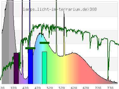 total ( 0 nm - 0 nm) 824 µW/cm² = 8.24 W/m² UVC ( 0 nm - 280 nm) 0.759 µW/cm² = 0.00759 W/m² non-terrestrial ( 0 nm - 290 nm) 1.13 µW/cm² = 0.0113 W/m² total2 ( 250 nm - 880 nm) 824 µW/cm² = 8.24 W/m² UVB (EU) ( 280 nm - 315 nm) 22.9 µW/cm² = 0.229 W/m² UVB (US) ( 280 nm - 320 nm) 33.6 µW/cm² = 0.336 W/m² UVA+B ( 280 nm - 380 nm) 253 µW/cm² = 2.53 W/m² Solar UVB ( 290 nm - 315 nm) 22.5 µW/cm² = 0.225 W/m² UVA D3 regulating ( 315 nm - 335 nm) 54 µW/cm² = 0.54 W/m² UVA (EU) ( 315 nm - 380 nm) 230 µW/cm² = 2.3 W/m² UVA2 (medical definition) ( 320 nm - 340 nm) 62.2 µW/cm² = 0.622 W/m² UVA (US) ( 320 nm - 380 nm) 219 µW/cm² = 2.19 W/m² UVA1 (variant) ( 335 nm - 380 nm) 176 µW/cm² = 1.76 W/m² UVA1 (medical) ( 340 nm - 400 nm) 176 µW/cm² = 1.76 W/m² vis. UVA ( 350 nm - 380 nm) 115 µW/cm² = 1.15 W/m² VIS Rep3 ( 350 nm - 600 nm) 533 µW/cm² = 5.33 W/m² VIS Rep4 ( 350 nm - 700 nm) 652 µW/cm² = 6.52 W/m² purple ( 380 nm - 420 nm) 44.8 µW/cm² = 0.448 W/m² VIS ( 380 nm - 780 nm) 564 µW/cm² = 5.64 W/m² VIS2 ( 400 nm - 680 nm) 504 µW/cm² = 5.04 W/m² PAR ( 400 nm - 700 nm) 519 µW/cm² = 5.19 W/m² tmp ( 400 nm - 1100 nm) 552 µW/cm² = 5.52 W/m² blue ( 420 nm - 490 nm) 166 µW/cm² = 1.66 W/m² green ( 490 nm - 575 nm) 166 µW/cm² = 1.66 W/m² yellow ( 575 nm - 585 nm) 19.9 µW/cm² = 0.199 W/m² orange ( 585 nm - 650 nm) 92.8 µW/cm² = 0.928 W/m² red ( 650 nm - 780 nm) 74.2 µW/cm² = 0.742 W/m² IR2 ( 655 nm - 685 nm) 30.8 µW/cm² = 0.308 W/m² IRA ( 700 nm - 1400 nm) 32.5 µW/cm² = 0.325 W/m² IRB ( 1400 nm - 3000 nm) 0 µW/cm² = 0 W/m²