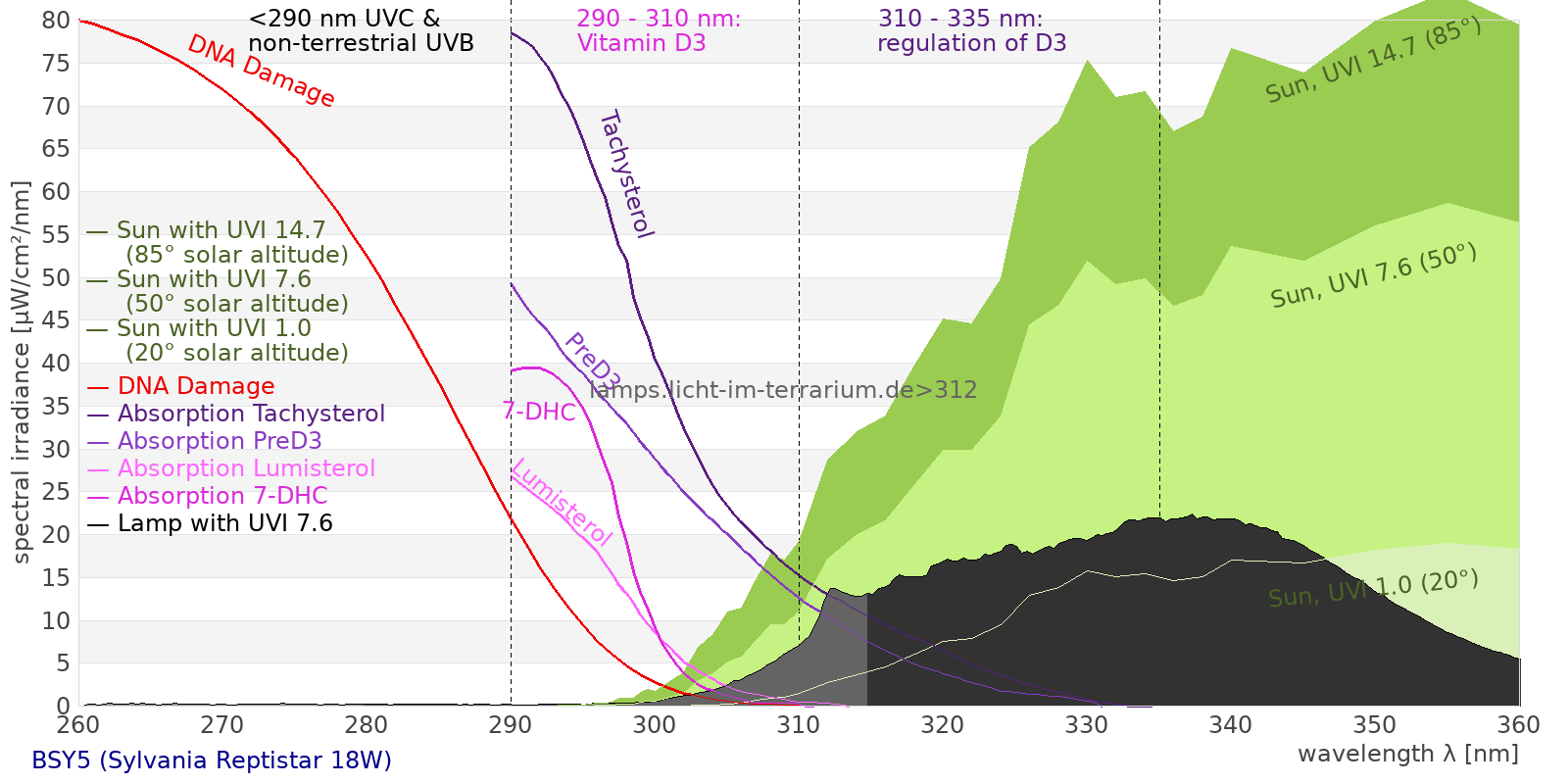Erythema 1.77 UV-Index Pyrimidine dimerization of DNA 12.3 µW/cm² Photoceratitis 2.34 µW/cm² Photoconjunctivitis 1.35 µW/cm² DNA Damage 1.61 Vitamin D3 4.88 µW/cm² Photosynthesis 326 µW/cm² Luminosity 1200 lx Human L-Cone 176 µW/cm² Human M-Cone 155 µW/cm² Human S-Cone 118 µW/cm² CIE X 160 µW/cm² CIE Y 166 µW/cm² CIE Z 221 µW/cm² PAR PPFD 21.7 µmol/m²/s Extinction preD3 49.8 e-3*m²/mol Extinction Tachysterol 160 e-3*m²/mol Exctincition PreD3 31200 m²/mol Extinction Lumisterol 16.2 m²/mol Exctincition Tachysterol 234000 m²/mol Extinction 7DHC 17.9 m²/mol L-Cone 146 µW/cm² M-Cone 173 µW/cm² S-Cone 202 µW/cm² U-Cone 80.7 µW/cm² UVR - ICNIRP 2004 2.14 Rel Biol Eff Melatonin Supression 165 µW/cm² Blue Light Hazard 133 µW/cm² (111 µW/cm² per 1000 lx) CIE 174:2006 PreVit D3 5.25 µW/cm² Lumen Reptil 1360 "pseudo-lx" Vitamin D3 Degradation 7.28 µW/cm² Actinic UV 2.13 µW/cm² (17.8 mW/klm) Exctincition Lumisterol 19200 m²/mol Exctincition 7DHC 19500 m²/mol Exctincition Toxisterols 9600 m²/mol