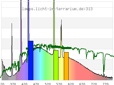 Whereas a spectrometer measures the intensity in every tiny wavelength interval resulting in thousands of individual intensities, the human eye only measures three intensities detected by the three cones. The same is true for the reptile eye with usually three or four photoreceptors. Effectively the detailled spectrum displayed above reduces to a much compacter bar graph displayed below. The photoreceptor sensitivites from these L-Cone, M-Cone, S-Cone, and U-Cone are used, they are chosen as an average of measured reptile photoreceptor sensitivity curves. The bar graph also shows as reference the intensity seen by the three or four photoreceptors for average sunlight (ASTM spectrum).