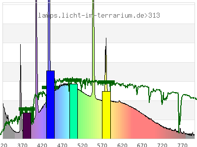 total ( 0 nm - 0 nm) 684 µW/cm² = 6.84 W/m² UVC ( 0 nm - 280 nm) 1.18 µW/cm² = 0.0118 W/m² non-terrestrial ( 0 nm - 290 nm) 1.59 µW/cm² = 0.0159 W/m² total2 ( 250 nm - 880 nm) 684 µW/cm² = 6.84 W/m² UVB (EU) ( 280 nm - 315 nm) 26.6 µW/cm² = 0.266 W/m² UVB (US) ( 280 nm - 320 nm) 34.1 µW/cm² = 0.341 W/m² UVA+B ( 280 nm - 380 nm) 73.5 µW/cm² = 0.735 W/m² Solar UVB ( 290 nm - 315 nm) 26.2 µW/cm² = 0.262 W/m² UVA D3 regulating ( 315 nm - 335 nm) 22.5 µW/cm² = 0.225 W/m² UVA (EU) ( 315 nm - 380 nm) 46.9 µW/cm² = 0.469 W/m² UVA2 (medical definition) ( 320 nm - 340 nm) 17.9 µW/cm² = 0.179 W/m² UVA (US) ( 320 nm - 380 nm) 39.4 µW/cm² = 0.394 W/m² UVA1 (variant) ( 335 nm - 380 nm) 24.3 µW/cm² = 0.243 W/m² UVA1 (medical) ( 340 nm - 400 nm) 33.6 µW/cm² = 0.336 W/m² vis. UVA ( 350 nm - 380 nm) 17.9 µW/cm² = 0.179 W/m² VIS Rep3 ( 350 nm - 600 nm) 474 µW/cm² = 4.74 W/m² VIS Rep4 ( 350 nm - 700 nm) 587 µW/cm² = 5.87 W/m² purple ( 380 nm - 420 nm) 53.1 µW/cm² = 0.531 W/m² VIS ( 380 nm - 780 nm) 601 µW/cm² = 6.01 W/m² VIS2 ( 400 nm - 680 nm) 542 µW/cm² = 5.42 W/m² PAR ( 400 nm - 700 nm) 557 µW/cm² = 5.57 W/m² tmp ( 400 nm - 1100 nm) 597 µW/cm² = 5.97 W/m² blue ( 420 nm - 490 nm) 178 µW/cm² = 1.78 W/m² green ( 490 nm - 575 nm) 178 µW/cm² = 1.78 W/m² yellow ( 575 nm - 585 nm) 24.5 µW/cm² = 0.245 W/m² orange ( 585 nm - 650 nm) 89.8 µW/cm² = 0.898 W/m² red ( 650 nm - 780 nm) 77.2 µW/cm² = 0.772 W/m² IR2 ( 655 nm - 685 nm) 29.2 µW/cm² = 0.292 W/m² IRA ( 700 nm - 1400 nm) 39.5 µW/cm² = 0.395 W/m² IRB ( 1400 nm - 3000 nm) 0 µW/cm² = 0 W/m²