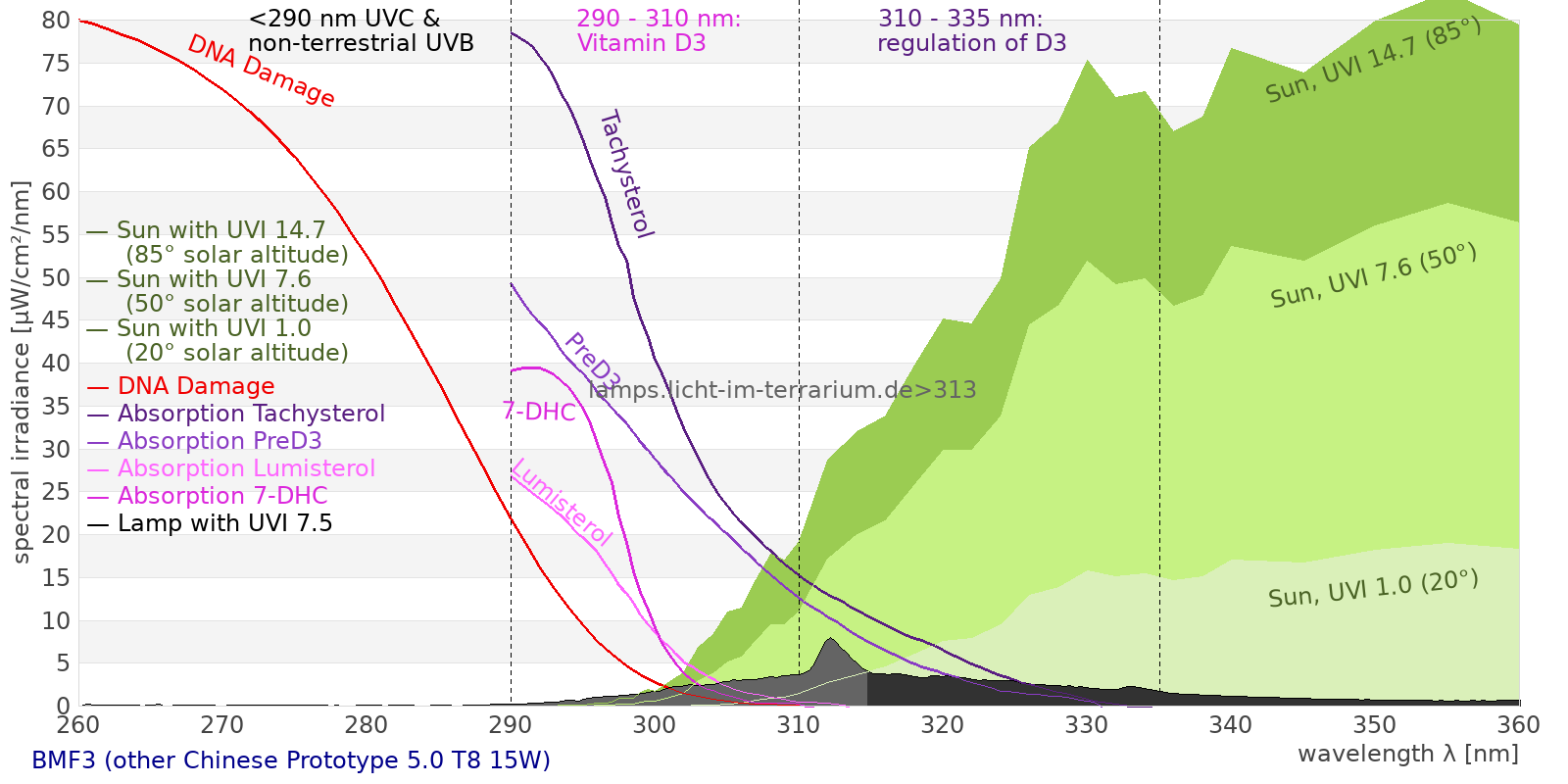 This process prevents any overdose of vitamin D3 from UV radiation with a spectrum similar to sunlight. As a comparison the solar spectra at 20°(id:14) and at 85°(id:21) solar angle are shown.