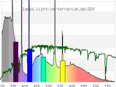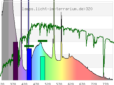 Whereas a spectrometer measures the intensity in every tiny wavelength interval resulting in thousands of individual intensities, the human eye only measures three intensities detected by the three cones. The same is true for the reptile eye with usually three or four photoreceptors. Effectively the detailled spectrum displayed above reduces to a much compacter bar graph displayed below. The photoreceptor sensitivites from these L-Cone, M-Cone, S-Cone, and U-Cone are used, they are chosen as an average of measured reptile photoreceptor sensitivity curves. The bar graph also shows as reference the intensity seen by the three or four photoreceptors for average sunlight (ASTM spectrum).