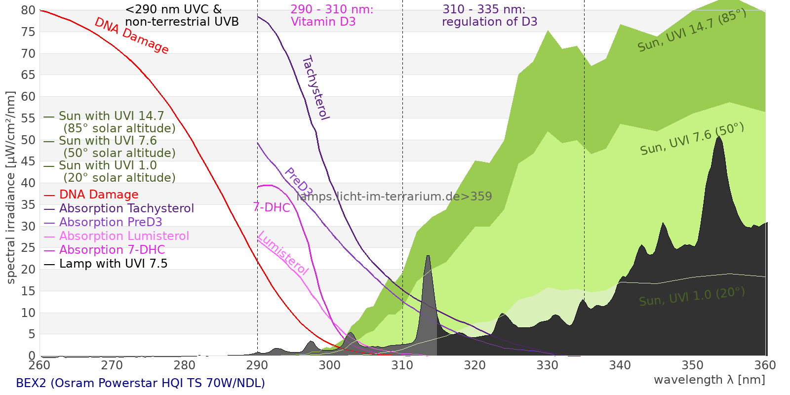 This process prevents any overdose of vitamin D3 from UV radiation with a spectrum similar to sunlight. As a comparison the solar spectra at 20°(id:14) and at 85°(id:21) solar angle are shown.