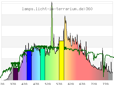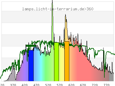 total ( 0 nm - 0 nm) 5630 µW/cm² = 56.3 W/m² UVC ( 0 nm - 280 nm) 0.289 µW/cm² = 0.00289 W/m² non-terrestrial ( 0 nm - 290 nm) 0.439 µW/cm² = 0.00439 W/m² total2 ( 250 nm - 880 nm) 5630 µW/cm² = 56.3 W/m² UVB (EU) ( 280 nm - 315 nm) 0.698 µW/cm² = 0.00698 W/m² UVB (US) ( 280 nm - 320 nm) 0.871 µW/cm² = 0.00871 W/m² UVA+B ( 280 nm - 380 nm) 139 µW/cm² = 1.39 W/m² Solar UVB ( 290 nm - 315 nm) 0.549 µW/cm² = 0.00549 W/m² UVA D3 regulating ( 315 nm - 335 nm) 1.09 µW/cm² = 0.0109 W/m² UVA (EU) ( 315 nm - 380 nm) 138 µW/cm² = 1.38 W/m² UVA2 (medical definition) ( 320 nm - 340 nm) 1.98 µW/cm² = 0.0198 W/m² UVA (US) ( 320 nm - 380 nm) 138 µW/cm² = 1.38 W/m² UVA1 (variant) ( 335 nm - 380 nm) 137 µW/cm² = 1.37 W/m² UVA1 (medical) ( 340 nm - 400 nm) 215 µW/cm² = 2.15 W/m² vis. UVA ( 350 nm - 380 nm) 128 µW/cm² = 1.28 W/m² VIS Rep3 ( 350 nm - 600 nm) 3210 µW/cm² = 32.1 W/m² VIS Rep4 ( 350 nm - 700 nm) 4780 µW/cm² = 47.8 W/m² purple ( 380 nm - 420 nm) 274 µW/cm² = 2.74 W/m² VIS ( 380 nm - 780 nm) 5150 µW/cm² = 51.5 W/m² VIS2 ( 400 nm - 680 nm) 4350 µW/cm² = 43.5 W/m² PAR ( 400 nm - 700 nm) 4580 µW/cm² = 45.8 W/m² tmp ( 400 nm - 1100 nm) 5410 µW/cm² = 54.1 W/m² blue ( 420 nm - 490 nm) 976 µW/cm² = 9.76 W/m² green ( 490 nm - 575 nm) 1320 µW/cm² = 13.2 W/m² yellow ( 575 nm - 585 nm) 158 µW/cm² = 1.58 W/m² orange ( 585 nm - 650 nm) 1280 µW/cm² = 12.8 W/m² red ( 650 nm - 780 nm) 1140 µW/cm² = 11.4 W/m² IR2 ( 655 nm - 685 nm) 416 µW/cm² = 4.16 W/m² IRA ( 700 nm - 1400 nm) 832 µW/cm² = 8.32 W/m² IRB ( 1400 nm - 3000 nm) 0 µW/cm² = 0 W/m²