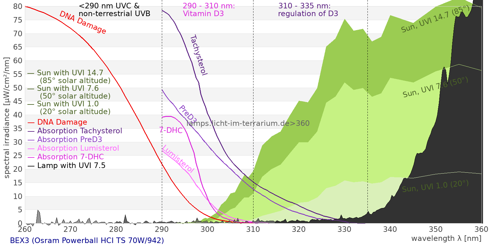This process prevents any overdose of vitamin D3 from UV radiation with a spectrum similar to sunlight. As a comparison the solar spectra at 20°(id:14) and at 85°(id:21) solar angle are shown.