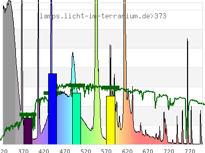 Whereas a spectrometer measures the intensity in every tiny wavelength interval resulting in thousands of individual intensities, the human eye only measures three intensities detected by the three cones. The same is true for the reptile eye with usually three or four photoreceptors. Effectively the detailled spectrum displayed above reduces to a much compacter bar graph displayed below. The photoreceptor sensitivites from these L-Cone, M-Cone, S-Cone, and U-Cone are used, they are chosen as an average of measured reptile photoreceptor sensitivity curves. The bar graph also shows as reference the intensity seen by the three or four photoreceptors for average sunlight (ASTM spectrum).