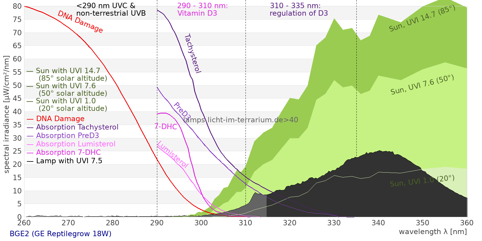 Erythema 1.17 UV-Index Pyrimidine dimerization of DNA 5.25 µW/cm² Photoceratitis 1.39 µW/cm² Photoconjunctivitis 1.2 µW/cm² DNA Damage 1.4 Vitamin D3 2.44 µW/cm² Photosynthesis 339 µW/cm² Luminosity 1370 lx Human L-Cone 203 µW/cm² Human M-Cone 175 µW/cm² Human S-Cone 118 µW/cm² CIE X 182 µW/cm² CIE Y 191 µW/cm² CIE Z 217 µW/cm² PAR PPFD 23.3 µmol/m²/s Extinction preD3 28 e-3*m²/mol Extinction Tachysterol 82.8 e-3*m²/mol Exctincition PreD3 20200 m²/mol Extinction Lumisterol 12.7 m²/mol Exctincition Tachysterol 125000 m²/mol Extinction 7DHC 14.6 m²/mol L-Cone 169 µW/cm² M-Cone 167 µW/cm² S-Cone 208 µW/cm² U-Cone 82.4 µW/cm² UVR - ICNIRP 2004 1.6 Rel Biol Eff Melatonin Supression 161 µW/cm² Blue Light Hazard 133 µW/cm² (96.9 µW/cm² per 1000 lx) CIE 174:2006 PreVit D3 2.59 µW/cm² Lumen Reptil 1440 "pseudo-lx" Vitamin D3 Degradation 3.38 µW/cm² Actinic UV 1.6 µW/cm² (11.6 mW/klm) Exctincition Lumisterol 14300 m²/mol Exctincition 7DHC 15500 m²/mol Exctincition Toxisterols 7720 m²/mol