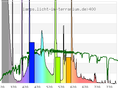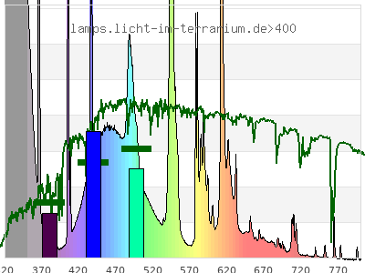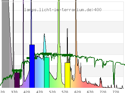 total ( 0 nm - 0 nm) 1880 µW/cm² = 18.8 W/m² UVC ( 0 nm - 280 nm) -3.9 µW/cm² = -0.039 W/m² non-terrestrial ( 0 nm - 290 nm) -4.01 µW/cm² = -0.0401 W/m² total2 ( 250 nm - 880 nm) 1890 µW/cm² = 18.9 W/m² UVB (EU) ( 280 nm - 315 nm) 138 µW/cm² = 1.38 W/m² UVB (US) ( 280 nm - 320 nm) 220 µW/cm² = 2.2 W/m² UVA+B ( 280 nm - 380 nm) 801 µW/cm² = 8.01 W/m² Solar UVB ( 290 nm - 315 nm) 139 µW/cm² = 1.39 W/m² UVA D3 regulating ( 315 nm - 335 nm) 329 µW/cm² = 3.29 W/m² UVA (EU) ( 315 nm - 380 nm) 662 µW/cm² = 6.62 W/m² UVA2 (medical definition) ( 320 nm - 340 nm) 332 µW/cm² = 3.32 W/m² UVA (US) ( 320 nm - 380 nm) 581 µW/cm² = 5.81 W/m² UVA1 (variant) ( 335 nm - 380 nm) 333 µW/cm² = 3.33 W/m² UVA1 (medical) ( 340 nm - 400 nm) 257 µW/cm² = 2.57 W/m² vis. UVA ( 350 nm - 380 nm) 121 µW/cm² = 1.21 W/m² VIS Rep3 ( 350 nm - 600 nm) 1020 µW/cm² = 10.2 W/m² VIS Rep4 ( 350 nm - 700 nm) 1200 µW/cm² = 12 W/m² purple ( 380 nm - 420 nm) 77.3 µW/cm² = 0.773 W/m² VIS ( 380 nm - 780 nm) 1090 µW/cm² = 10.9 W/m² VIS2 ( 400 nm - 680 nm) 1060 µW/cm² = 10.6 W/m² PAR ( 400 nm - 700 nm) 1070 µW/cm² = 10.7 W/m² tmp ( 400 nm - 1100 nm) 1080 µW/cm² = 10.8 W/m² blue ( 420 nm - 490 nm) 416 µW/cm² = 4.16 W/m² green ( 490 nm - 575 nm) 324 µW/cm² = 3.24 W/m² yellow ( 575 nm - 585 nm) 40.7 µW/cm² = 0.407 W/m² orange ( 585 nm - 650 nm) 187 µW/cm² = 1.87 W/m² red ( 650 nm - 780 nm) 47.1 µW/cm² = 0.471 W/m² IR2 ( 655 nm - 685 nm) 18.5 µW/cm² = 0.185 W/m² IRA ( 700 nm - 1400 nm) 12.3 µW/cm² = 0.123 W/m² IRB ( 1400 nm - 3000 nm) 0 µW/cm² = 0 W/m²