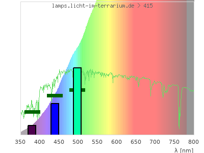 total ( 0 nm - 0 nm) 11100 µW/cm² = 111 W/m² UVC ( 0 nm - 280 nm) 0 µW/cm² = 0 W/m² non-terrestrial ( 0 nm - 290 nm) 0 µW/cm² = 0 W/m² total2 ( 250 nm - 880 nm) 11100 µW/cm² = 111 W/m² UVB (EU) ( 280 nm - 315 nm) 0.253 µW/cm² = 0.00253 W/m² UVB (US) ( 280 nm - 320 nm) 0.424 µW/cm² = 0.00424 W/m² UVA+B ( 280 nm - 380 nm) 29.6 µW/cm² = 0.296 W/m² Solar UVB ( 290 nm - 315 nm) 0.253 µW/cm² = 0.00253 W/m² UVA D3 regulating ( 315 nm - 335 nm) 1.46 µW/cm² = 0.0146 W/m² UVA (EU) ( 315 nm - 380 nm) 29.3 µW/cm² = 0.293 W/m² UVA2 (medical definition) ( 320 nm - 340 nm) 2.22 µW/cm² = 0.0222 W/m² UVA (US) ( 320 nm - 380 nm) 29.1 µW/cm² = 0.291 W/m² UVA1 (variant) ( 335 nm - 380 nm) 27.9 µW/cm² = 0.279 W/m² UVA1 (medical) ( 340 nm - 400 nm) 62.8 µW/cm² = 0.628 W/m² vis. UVA ( 350 nm - 380 nm) 24 µW/cm² = 0.24 W/m² VIS Rep3 ( 350 nm - 600 nm) 2630 µW/cm² = 26.3 W/m² VIS Rep4 ( 350 nm - 700 nm) 6110 µW/cm² = 61.1 W/m² purple ( 380 nm - 420 nm) 97.5 µW/cm² = 0.975 W/m² VIS ( 380 nm - 780 nm) 10000 µW/cm² = 100 W/m² VIS2 ( 400 nm - 680 nm) 5210 µW/cm² = 52.1 W/m² PAR ( 400 nm - 700 nm) 6050 µW/cm² = 60.5 W/m² tmp ( 400 nm - 1100 nm) 11100 µW/cm² = 111 W/m² blue ( 420 nm - 490 nm) 515 µW/cm² = 5.15 W/m² green ( 490 nm - 575 nm) 1390 µW/cm² = 13.9 W/m² yellow ( 575 nm - 585 nm) 228 µW/cm² = 2.28 W/m² orange ( 585 nm - 650 nm) 1890 µW/cm² = 18.9 W/m² red ( 650 nm - 780 nm) 5890 µW/cm² = 58.9 W/m² IRA ( 700 nm - 1400 nm) 5000 µW/cm² = 50 W/m² IR2 ( 720 nm - 1100 nm) 4090 µW/cm² = 40.9 W/m² IRB ( 1400 nm - 3000 nm) 0 µW/cm² = 0 W/m²