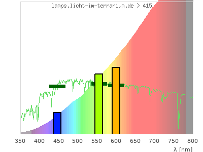 Whereas a spectrometer measures the intensity in every tiny wavelength interval resulting in thousands of individual intensities, the human eye only measures three intensities detected by the three cones. The same is true for the reptile eye with usually three or four photoreceptors. Effectively the detailled spectrum displayed above reduces to a much compacter bar graph displayed below. The photoreceptor sensitivites from these L-Cone, M-Cone, S-Cone, and U-Cone are used, they are chosen as an average of measured reptile photoreceptor sensitivity curves. The bar graph also shows as reference the intensity seen by the three or four photoreceptors for average sunlight (id 1).