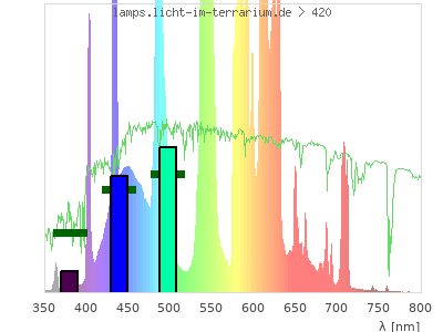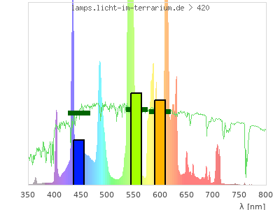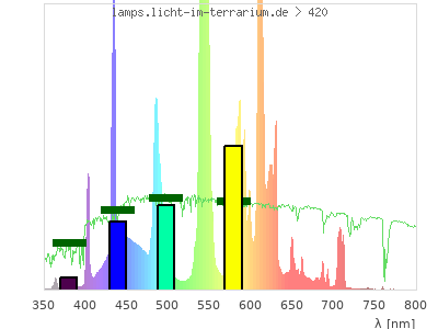 Whereas a spectrometer measures the intensity in every tiny wavelength interval resulting in thousands of individual intensities, the human eye only measures three intensities detected by the three cones. The same is true for the reptile eye with usually three or four photoreceptors. Effectively the detailled spectrum displayed above reduces to a much compacter bar graph displayed below. The photoreceptor sensitivites from these L-Cone, M-Cone, S-Cone, and U-Cone are used, they are chosen as an average of measured reptile photoreceptor sensitivity curves. The bar graph also shows as reference the intensity seen by the three or four photoreceptors for average sunlight (id 1).