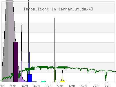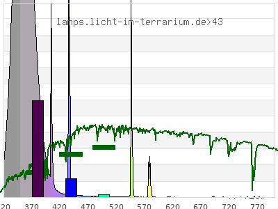 Whereas a spectrometer measures the intensity in every tiny wavelength interval resulting in thousands of individual intensities, the human eye only measures three intensities detected by the three cones. The same is true for the reptile eye with usually three or four photoreceptors. Effectively the detailled spectrum displayed above reduces to a much compacter bar graph displayed below. The photoreceptor sensitivites from these L-Cone, M-Cone, S-Cone, and U-Cone are used, they are chosen as an average of measured reptile photoreceptor sensitivity curves. The bar graph also shows as reference the intensity seen by the three or four photoreceptors for average sunlight (ASTM spectrum).