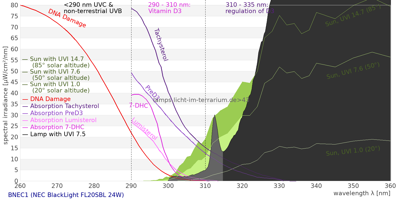 This process prevents any overdose of vitamin D3 from UV radiation with a spectrum similar to sunlight. As a comparison the solar spectra at 20°(id:14) and at 85°(id:21) solar angle are shown.