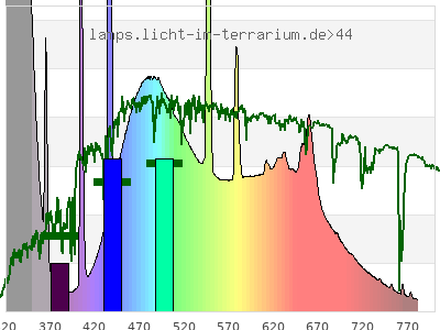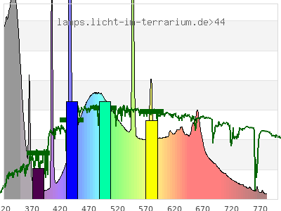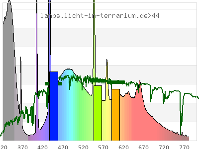 total ( 0 nm - 0 nm) 818 µW/cm² = 8.18 W/m² UVC ( 0 nm - 280 nm) 2 µW/cm² = 0.02 W/m² non-terrestrial ( 0 nm - 290 nm) 2.57 µW/cm² = 0.0257 W/m² total2 ( 250 nm - 880 nm) 818 µW/cm² = 8.18 W/m² UVB (EU) ( 280 nm - 315 nm) 25.7 µW/cm² = 0.257 W/m² UVB (US) ( 280 nm - 320 nm) 45.4 µW/cm² = 0.454 W/m² UVA+B ( 280 nm - 380 nm) 215 µW/cm² = 2.15 W/m² Solar UVB ( 290 nm - 315 nm) 25.1 µW/cm² = 0.251 W/m² UVA D3 regulating ( 315 nm - 335 nm) 86.6 µW/cm² = 0.866 W/m² UVA (EU) ( 315 nm - 380 nm) 189 µW/cm² = 1.89 W/m² UVA2 (medical definition) ( 320 nm - 340 nm) 92.5 µW/cm² = 0.925 W/m² UVA (US) ( 320 nm - 380 nm) 169 µW/cm² = 1.69 W/m² UVA1 (variant) ( 335 nm - 380 nm) 102 µW/cm² = 1.02 W/m² UVA1 (medical) ( 340 nm - 400 nm) 81 µW/cm² = 0.81 W/m² vis. UVA ( 350 nm - 380 nm) 36.6 µW/cm² = 0.366 W/m² VIS Rep3 ( 350 nm - 600 nm) 465 µW/cm² = 4.65 W/m² VIS Rep4 ( 350 nm - 700 nm) 609 µW/cm² = 6.09 W/m² purple ( 380 nm - 420 nm) 29.2 µW/cm² = 0.292 W/m² VIS ( 380 nm - 780 nm) 601 µW/cm² = 6.01 W/m² VIS2 ( 400 nm - 680 nm) 551 µW/cm² = 5.51 W/m² PAR ( 400 nm - 700 nm) 568 µW/cm² = 5.68 W/m² tmp ( 400 nm - 1100 nm) 597 µW/cm² = 5.97 W/m² blue ( 420 nm - 490 nm) 174 µW/cm² = 1.74 W/m² green ( 490 nm - 575 nm) 181 µW/cm² = 1.81 W/m² yellow ( 575 nm - 585 nm) 22.1 µW/cm² = 0.221 W/m² orange ( 585 nm - 650 nm) 102 µW/cm² = 1.02 W/m² red ( 650 nm - 780 nm) 92.6 µW/cm² = 0.926 W/m² IR2 ( 655 nm - 685 nm) 42.7 µW/cm² = 0.427 W/m² IRA ( 700 nm - 1400 nm) 28.6 µW/cm² = 0.286 W/m² IRB ( 1400 nm - 3000 nm) 0 µW/cm² = 0 W/m²