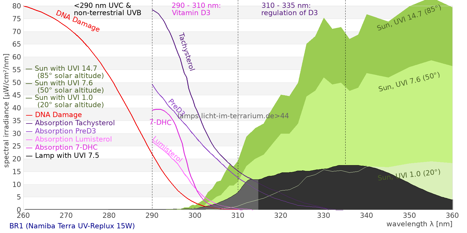 This process prevents any overdose of vitamin D3 from UV radiation with a spectrum similar to sunlight. As a comparison the solar spectra at 20°(id:14) and at 85°(id:21) solar angle are shown.