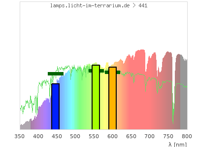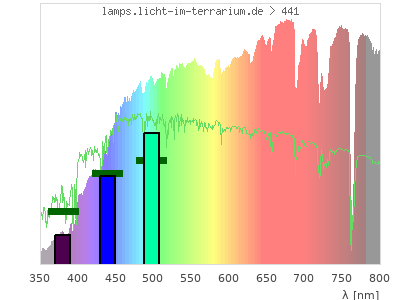 Whereas a spectrometer measures the intensity in every tiny wavelength interval resulting in thousands of individual intensities, the human eye only measures three intensities detected by the three cones. The same is true for the reptile eye with usually three or four photoreceptors. Effectively the detailled spectrum displayed above reduces to a much compacter bar graph displayed below. The photoreceptor sensitivites from these L-Cone, M-Cone, S-Cone, and U-Cone are used, they are chosen as an average of measured reptile photoreceptor sensitivity curves. The bar graph also shows as reference the intensity seen by the three or four photoreceptors for average sunlight (id 1).