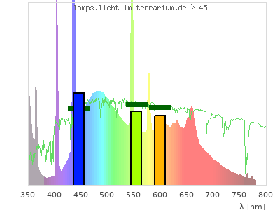 Whereas a spectrometer measures the intensity in every tiny wavelength interval resulting in thousands of individual intensities, the human eye only measures three intensities detected by the three cones. The same is true for the reptile eye with usually three or four photoreceptors. Effectively the detailled spectrum displayed above reduces to a much compacter bar graph displayed below. The photoreceptor sensitivites from these L-Cone, M-Cone, S-Cone, and U-Cone are used, they are chosen as an average of measured reptile photoreceptor sensitivity curves. The bar graph also shows as reference the intensity seen by the three or four photoreceptors for average sunlight (id 1).