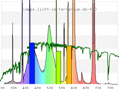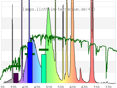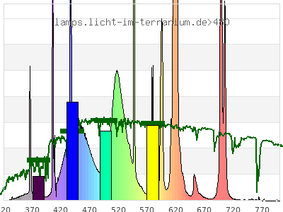 Whereas a spectrometer measures the intensity in every tiny wavelength interval resulting in thousands of individual intensities, the human eye only measures three intensities detected by the three cones. The same is true for the reptile eye with usually three or four photoreceptors. Effectively the detailled spectrum displayed above reduces to a much compacter bar graph displayed below. The photoreceptor sensitivites from these L-Cone, M-Cone, S-Cone, and U-Cone are used, they are chosen as an average of measured reptile photoreceptor sensitivity curves. The bar graph also shows as reference the intensity seen by the three or four photoreceptors for average sunlight (ASTM spectrum).