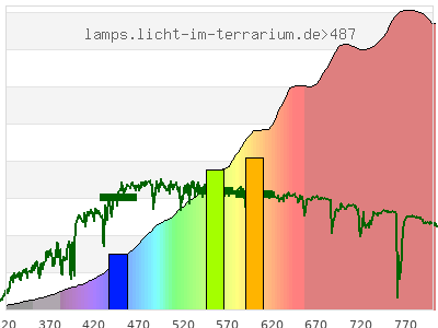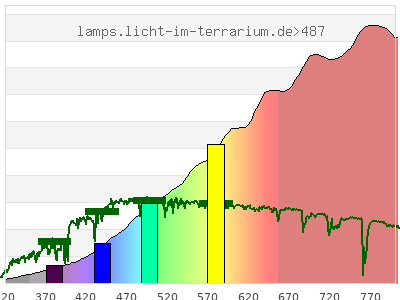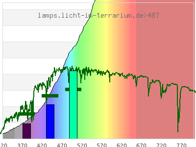 Whereas a spectrometer measures the intensity in every tiny wavelength interval resulting in thousands of individual intensities, the human eye only measures three intensities detected by the three cones. The same is true for the reptile eye with usually three or four photoreceptors. Effectively the detailled spectrum displayed above reduces to a much compacter bar graph displayed below. The photoreceptor sensitivites from these L-Cone, M-Cone, S-Cone, and U-Cone are used, they are chosen as an average of measured reptile photoreceptor sensitivity curves. The bar graph also shows as reference the intensity seen by the three or four photoreceptors for average sunlight (ASTM spectrum).