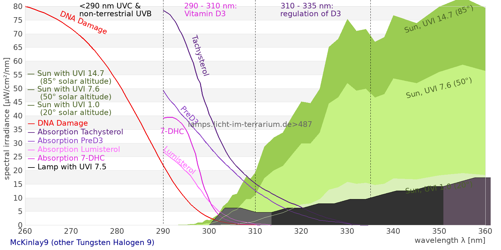 This process prevents any overdose of vitamin D3 from UV radiation with a spectrum similar to sunlight. As a comparison the solar spectra at 20°(id:14) and at 85°(id:21) solar angle are shown.