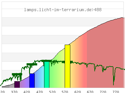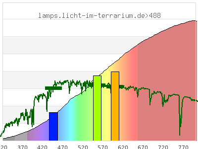 total ( 0 nm - 0 nm) 20300 µW/cm² = 203 W/m² UVC ( 0 nm - 280 nm) 0 µW/cm² = 0 W/m² non-terrestrial ( 0 nm - 290 nm) 0 µW/cm² = 0 W/m² total2 ( 250 nm - 880 nm) 5980 µW/cm² = 59.8 W/m² UVB (EU) ( 280 nm - 315 nm) 2.86 µW/cm² = 0.0286 W/m² UVB (US) ( 280 nm - 320 nm) 3.84 µW/cm² = 0.0384 W/m² UVA+B ( 280 nm - 380 nm) 52.5 µW/cm² = 0.525 W/m² Solar UVB ( 290 nm - 315 nm) 2.86 µW/cm² = 0.0286 W/m² UVA D3 regulating ( 315 nm - 335 nm) 8.07 µW/cm² = 0.0807 W/m² UVA (EU) ( 315 nm - 380 nm) 49.6 µW/cm² = 0.496 W/m² UVA2 (medical definition) ( 320 nm - 340 nm) 9.06 µW/cm² = 0.0906 W/m² UVA (US) ( 320 nm - 380 nm) 48.7 µW/cm² = 0.487 W/m² UVA1 (variant) ( 335 nm - 380 nm) 41.6 µW/cm² = 0.416 W/m² UVA1 (medical) ( 340 nm - 400 nm) 74.3 µW/cm² = 0.743 W/m² vis. UVA ( 350 nm - 380 nm) 32.8 µW/cm² = 0.328 W/m² VIS Rep3 ( 350 nm - 600 nm) 1420 µW/cm² = 14.2 W/m² VIS Rep4 ( 350 nm - 700 nm) 2810 µW/cm² = 28.1 W/m² purple ( 380 nm - 420 nm) 82.4 µW/cm² = 0.824 W/m² VIS ( 380 nm - 780 nm) 4160 µW/cm² = 41.6 W/m² VIS2 ( 400 nm - 680 nm) 2420 µW/cm² = 24.2 W/m² PAR ( 400 nm - 700 nm) 2740 µW/cm² = 27.4 W/m² tmp ( 400 nm - 1100 nm) 10000 µW/cm² = 100 W/m² blue ( 420 nm - 490 nm) 296 µW/cm² = 2.96 W/m² green ( 490 nm - 575 nm) 738 µW/cm² = 7.38 W/m² yellow ( 575 nm - 585 nm) 74.1 µW/cm² = 0.741 W/m² orange ( 585 nm - 650 nm) 864 µW/cm² = 8.64 W/m² red ( 650 nm - 780 nm) 2100 µW/cm² = 21 W/m² IR2 ( 655 nm - 685 nm) 458 µW/cm² = 4.58 W/m² IRA ( 700 nm - 1400 nm) 11900 µW/cm² = 119 W/m² IRB ( 1400 nm - 3000 nm) 5550 µW/cm² = 55.5 W/m²