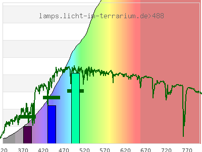 Whereas a spectrometer measures the intensity in every tiny wavelength interval resulting in thousands of individual intensities, the human eye only measures three intensities detected by the three cones. The same is true for the reptile eye with usually three or four photoreceptors. Effectively the detailled spectrum displayed above reduces to a much compacter bar graph displayed below. The photoreceptor sensitivites from these L-Cone, M-Cone, S-Cone, and U-Cone are used, they are chosen as an average of measured reptile photoreceptor sensitivity curves. The bar graph also shows as reference the intensity seen by the three or four photoreceptors for average sunlight (ASTM spectrum).