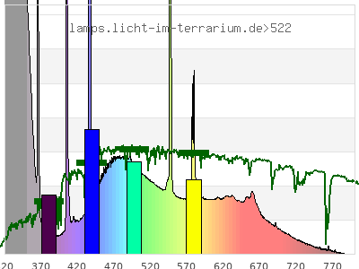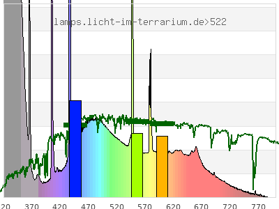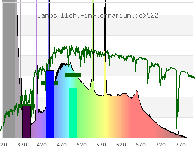 Whereas a spectrometer measures the intensity in every tiny wavelength interval resulting in thousands of individual intensities, the human eye only measures three intensities detected by the three cones. The same is true for the reptile eye with usually three or four photoreceptors. Effectively the detailled spectrum displayed above reduces to a much compacter bar graph displayed below. The photoreceptor sensitivites from these L-Cone, M-Cone, S-Cone, and U-Cone are used, they are chosen as an average of measured reptile photoreceptor sensitivity curves. The bar graph also shows as reference the intensity seen by the three or four photoreceptors for average sunlight (ASTM spectrum).