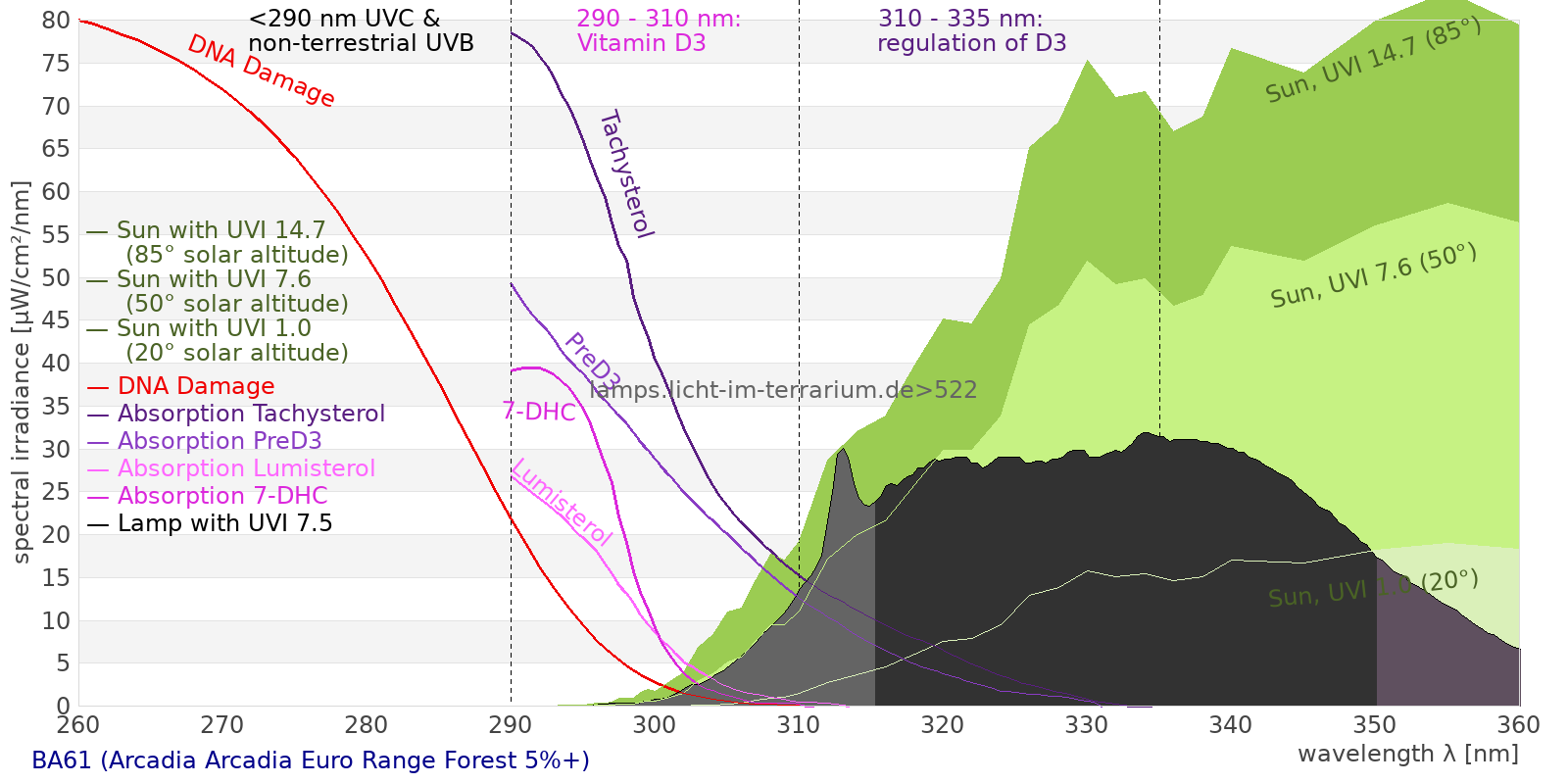 Erythema 2.94 UV-Index Pyrimidine dimerization of DNA 41.2 µW/cm² Photoceratitis 4.81 µW/cm² Photoconjunctivitis 0.0498 µW/cm² DNA Damage 0.162 Vitamin D3 13.6 µW/cm² Photosynthesis 430 µW/cm² Luminosity 1540 lx Human L-Cone 224 µW/cm² Human M-Cone 203 µW/cm² Human S-Cone 173 µW/cm² CIE X 204 µW/cm² CIE Y 213 µW/cm² CIE Z 321 µW/cm² PAR PPFD 28.5 µmol/m²/s Extinction preD3 116 e-3*m²/mol Extinction Tachysterol 418 e-3*m²/mol Exctincition PreD3 55100 m²/mol Extinction Lumisterol 8.57 m²/mol Exctincition Tachysterol 619000 m²/mol Extinction 7DHC 4.85 m²/mol L-Cone 182 µW/cm² M-Cone 226 µW/cm² S-Cone 304 µW/cm² U-Cone 144 µW/cm² UVR - ICNIRP 2004 1.78 Rel Biol Eff Melatonin Supression 234 µW/cm² Blue Light Hazard 197 µW/cm² (128 µW/cm² per 1000 lx) CIE 174:2006 PreVit D3 14.9 µW/cm² Lumen Reptil 1880 "pseudo-lx" Vitamin D3 Degradation 22.1 µW/cm² Actinic UV 1.78 µW/cm² (11.6 mW/klm) Exctincition Lumisterol 15500 m²/mol Exctincition 7DHC 7420 m²/mol Exctincition Toxisterols 10800 m²/mol